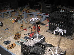 Ferals are deployed in defensive positions along the elevated highway (from top to bottom of the picture) with some in the craters where the highway interchange used to exist and some strong points in ruined buildings in front of the highway.. Their vehicles are in the rear as reserves. They also have one chopper (top left corner of picture.)